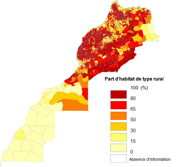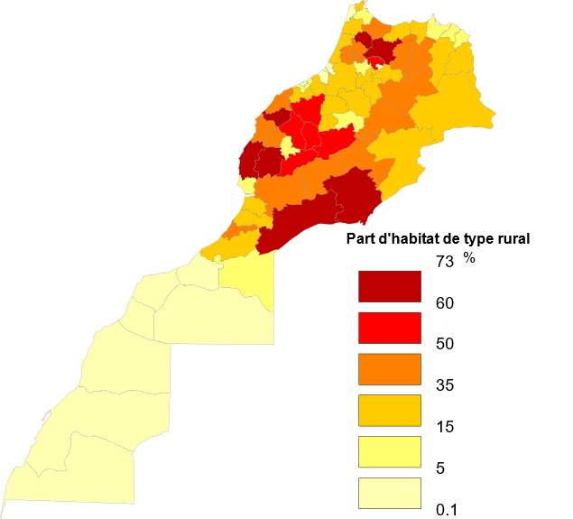 La lecture des cartes du part d’habitat de type rural à l’échelle de la commune ou de la province met en évidence la forte dissymétrie existant entre les centres urbains du royaume et les périphéries rurales. 27 provinces sur les 75 que compte le royaume chérifien ont plus des 2/3 de leur habitat constitué de construction de type rural, 14 en ont plus de la moitié. Dans les zones rurales des provinces, c’est 44 provinces sur 75 qui ont plus de la moitié de leur habitat de style rural. Chichaoua, El Haouz, Taroudant et Azilal, les provinces les plus éprouvées par les séismes ont des taux respectifs d’habitat rural de 71.7, 58.9, 40.2 et 52.6 %.